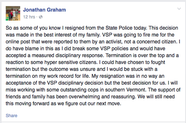 Seven Days, "The internal investigation was incomplete at the time of Corporal Graham’s resignation, thus there was no official conclusion made about any action to be taken. Due to the nature of the internal investigation into a Vermont state trooper, I cannot comment on the substance of Jon Graham’s social media content, or the evidence presented to us by a concerned citizen."