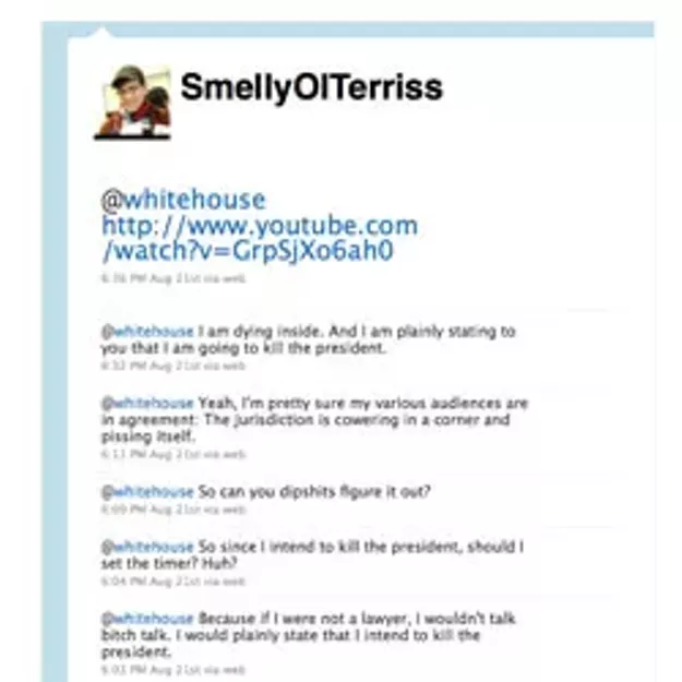 King’s are the latest in a string of death threats sent to Obama via Twitter. The news website Gawker has coined the term “death tweet” and documented at least two other cases, including a Secret Service investigation of conservative blogger Solly Forell, who wrote, “The next #American with a #Clear #Shot should drop #Obama like a bad habit.”