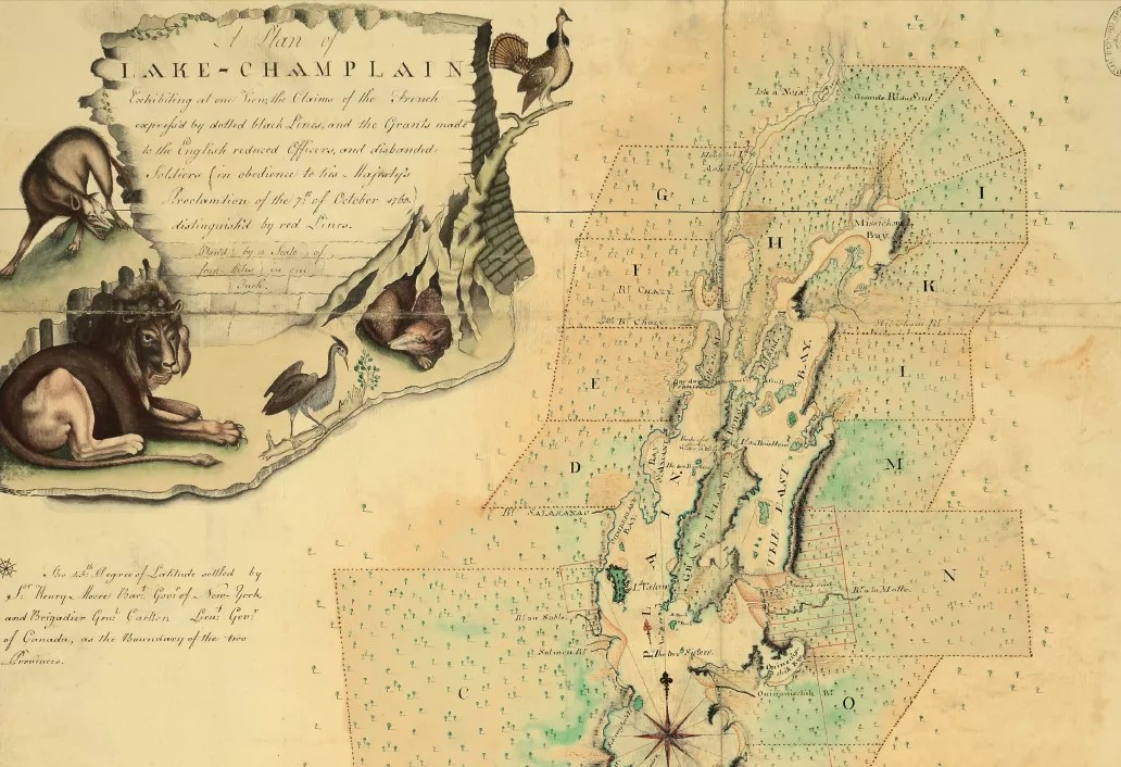 Even more interesting is the watchful lion that joins a wolf, a crane and a turkey in the cartouche in the map’s upper left corner. Cool your jets, Catamount Truthers: Just as in the present day, no lions romped through the Champlain Valley in the mid-18th century. Rather, as the authors write, the mapmaker included this fearsome beast in order to “convey … to those in London both the inherent possibilities and the dangers present in the colonies.”