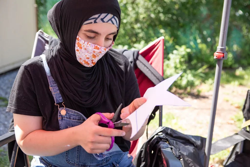 Julia Ciotti of Burlington, an assistant with Juniper Creative Arts, cutting out shapes for community members to paint. “At the center of it, it’s love and it’s spreading a message that people need to hear,” Ciotti said. “As the mother of a Black child, especially, it’s important to me that they know they are seen and they are powerful — and they have abilities they can tap into.” Credit: Luke Awtry