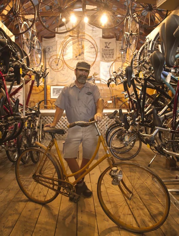 Eames doesn’t exempt himself from this blanket denunciation — he says he’s bothered by the “collecting thing” when he looks in the mirror in the morning — but he does offer an apologia of sorts. “What fascinated me about old bikes was not the gathering of objects themselves,” Eames says while seated on a bench outside the Old Spokes Home, the cycling shop he owns on North Winooski Avenue in Burlington. “It was the developing of an understanding of how they transformed American society in the late 19th century.”