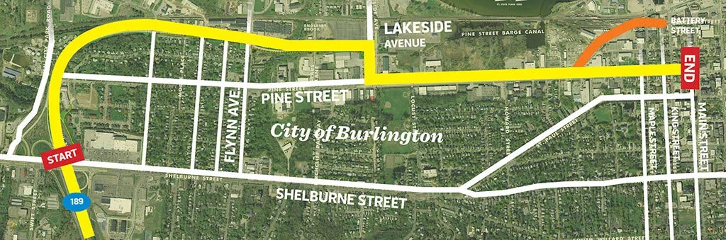 Envisioned as a four-lane highway in the 1960s, the modern Champlain Parkway is a low-speed roadway meant to improve traffic flow between the city’s South End and its downtown. The route would begin at the unfinished Interstate 189 interchange on Shelburne Road, extend from Home to Lakeside avenue, then jog down Pine Street to Main.