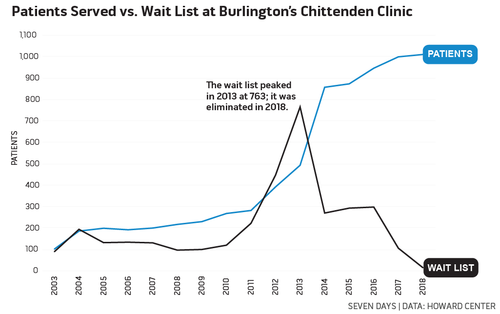 But hubs could only accept so many patients: In 2013 the wait list at the Chittenden Clinic reached 763 people. The way the state approached it, former health commissioner Chen explained, was to say: “‘We have this much money, this is how many individuals can go to the hub, and we capped it. We’re done. We’ve spent what we can on this problem.'”